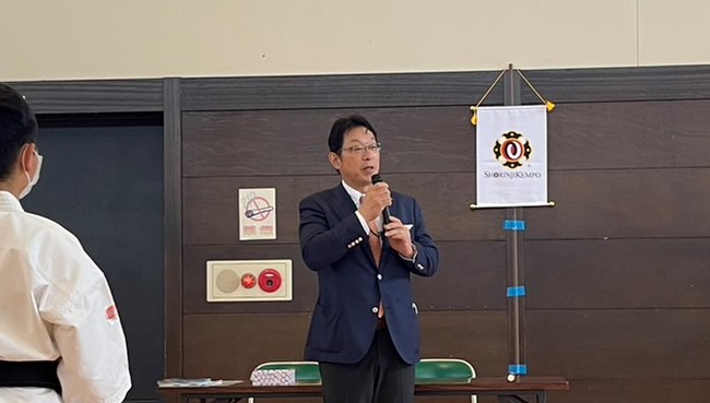 ご来賓の片岡総社市長より、総社市武道館が西日本豪雨の際に避難された200名の方の避難所として開放された歴史を踏まえ、少林寺拳法の演武がより多くの方に感動を与え、少林寺拳法に携わる拳士の心身の育成と発展を願われた事が印象的でありました。演武披露の後、中学校武道必修化について本県連の代表と会談が行われました。