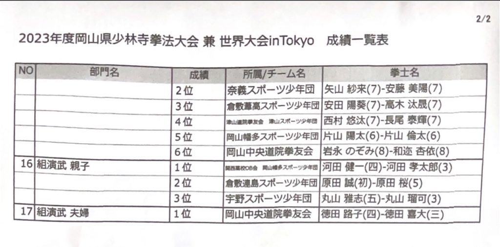 1位を受賞された拳士の皆さま、大変おめでとうございます。